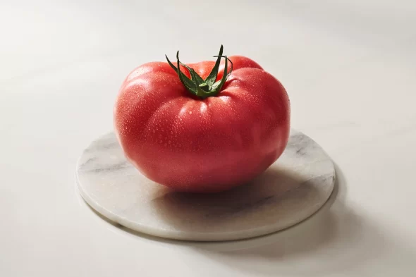 This beefsteak-style coral red tomato has large, firm, round, slightly ribbed fruits with broad and softly flattened shoulders. When you pick it up, you can tell its flesh is thick, rich, and juicy as it’s heavy! Its tangy aroma reminds us of the sweet candy from our childhood. It has a thin skin, and a condensed flesh with few seeds.