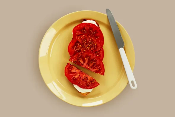 Brioche Toast with Tomato, Curry Mayonnaise, Honey, and Pistachios