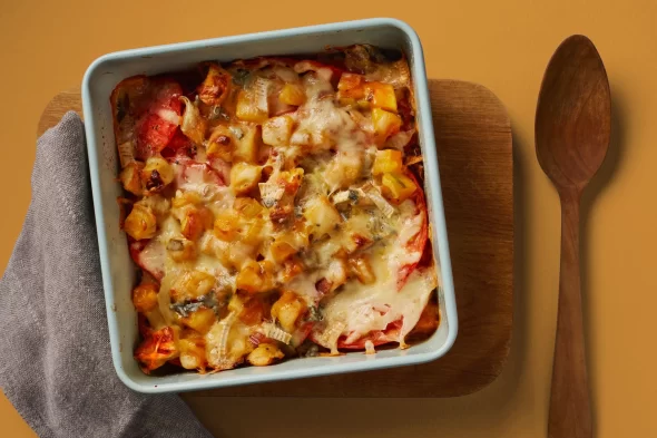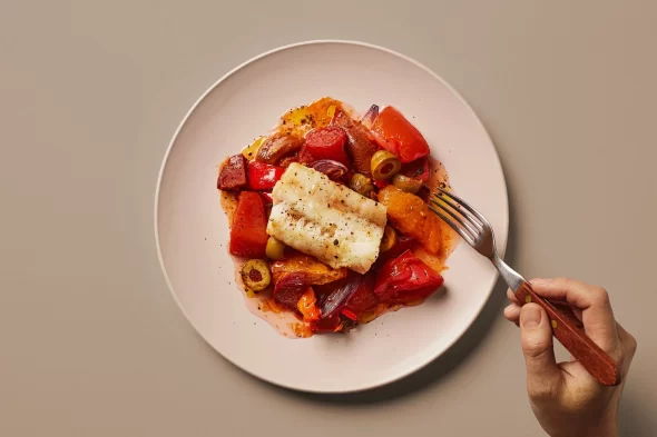 Cod with Tomato & Roasted Vegetables with Chorizo