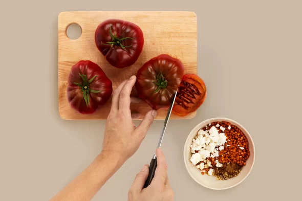 Pour les adeptes de saveurs méditerranéennes, cette recette de tomates noires avec salsa de lentilles fera des heureux. Mariant feta, épices zaatar, miel et coriandre fraîche, c’est un véritable voyage gustatif du pourtour de la Méditerranée à savourer en accompagnement ou en entrée. Les lentilles ajoutent une bonne dose de protéine aux nutriments naturellement présents dans la tomate pour un plat aussi succulent que bon pour la santé.